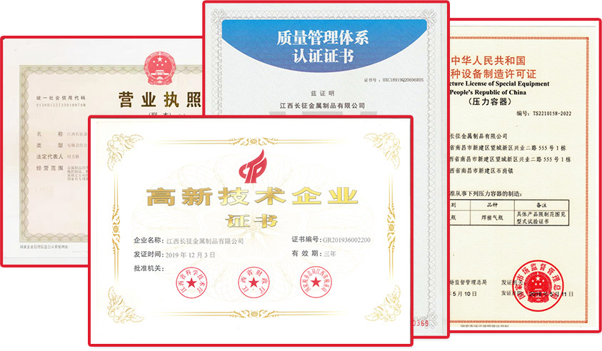 江西長征金屬制品有限公司,原大型航天軍工企業(yè)江西長征機器廠,是國家勞動部定點生產氣瓶的專業(yè)廠家。公司擁有雄厚的軍工技術力量,設備先進,檢測手段完備,按照GB/T5100標準和GB/T5842標準、GB/T17673標準要求,建立了嚴格的企業(yè)管理制度和完整有效的產品質量保證體系。